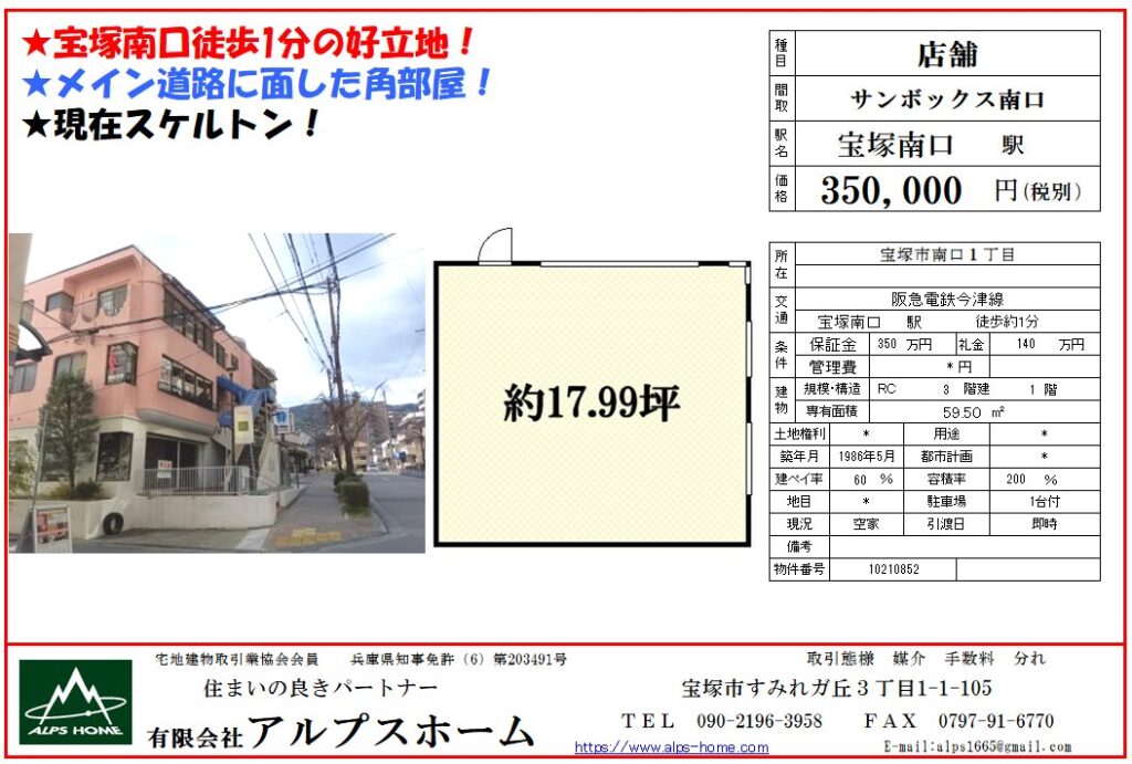 宝塚市 不動産 賃貸情報 賃貸情報 X Facebook LINE コピー 2024.06.152026.02.13 宝塚市の賃貸情報を掲載しています。 宝塚市逆瀬川賃貸マンション 逆瀬川ハイツ2号棟3F 6.5万円 宝塚市南口1丁目 貸店舗 サンボックス南口 385,000円 ALPSHOME